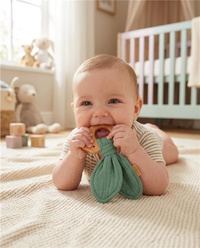 El chupete con muselina es un conjunto ideal para cuando a tu bebé le están saliendo los dientes. El chupete está hecho de madera de haya, segura para el medio ambiente, y de suave tela de muselina. Totalmente seguro para los bebés, ofrece un alivio reconfortante durante la dentición. También se puede utilizar como juguete para recién nacidos. El chupete combina perfectamente con nuestros otros productos de muselina, creando un hermoso conjunto que se puede regalar en una celebración infantil.