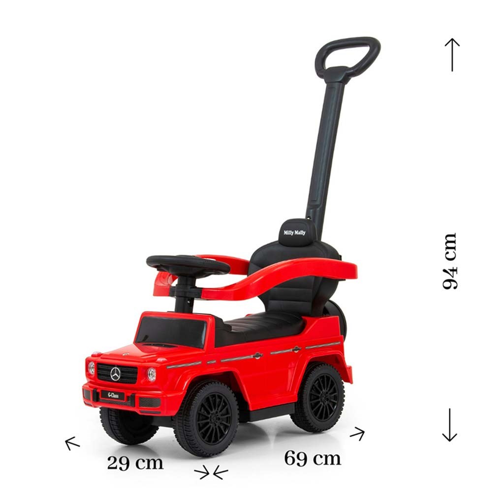 El patinete infantil con barra de guía MERCEDES G350d está fabricado bajo licencia del grupo MERCEDES. Su pequeño piloto o piloto se sentirá como en un auténtico jeep. El patinete está diseñado con atención a cada detalle y la calidad de los materiales utilizados. Su apariencia atraerá la atención no solo de cada niño, sino también de sus padres. El patinete ayuda a desarrollar las habilidades motoras del niño y su pequeño piloto podrá disfrutar de mucha diversión y risas. El coche cuenta con un volante de tres brazos con botones que emiten diversas melodías, el sonido del motor o una bocina. Está destinado tanto para los más pequeños que ya saben sentarse, como para los niños que ya han aprendido a caminar. El patinete tiene ruedas delanteras giratorias, un asiento amplio y cómodo con espacio de almacenamiento y una barra de guía cómoda y a la vez robusta, con la que se puede controlar el patinete. La barra de guía, los reposabrazos y los reposapiés son desmontables, permitiendo que el niño use el coche como un patinete clásico. Las baterías no están incluidas (2x AA 1.5V).