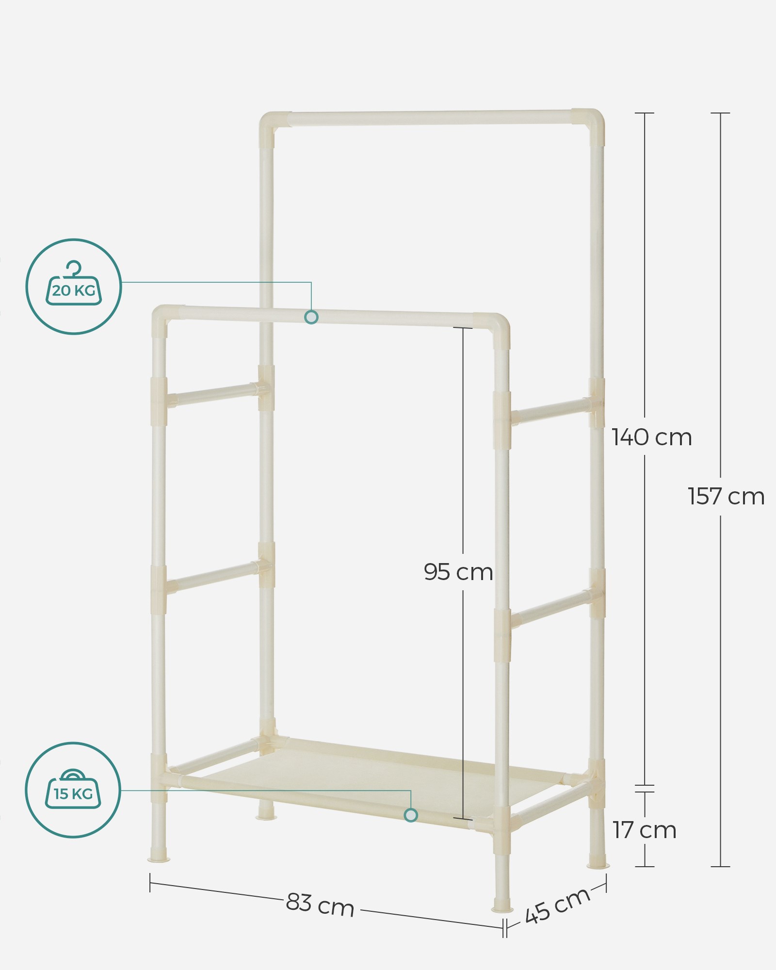 El perchero cuenta con 2 barras muy estables y resistentes para colgar abrigos, chaquetas, vestidos, camisas o blazers. También puede colgar bufandas, pañuelos o pilas en las barras. Es especialmente útil durante la temporada de bodas y celebraciones, cuando necesita tener camisas o vestidos perfectamente planchados listos.