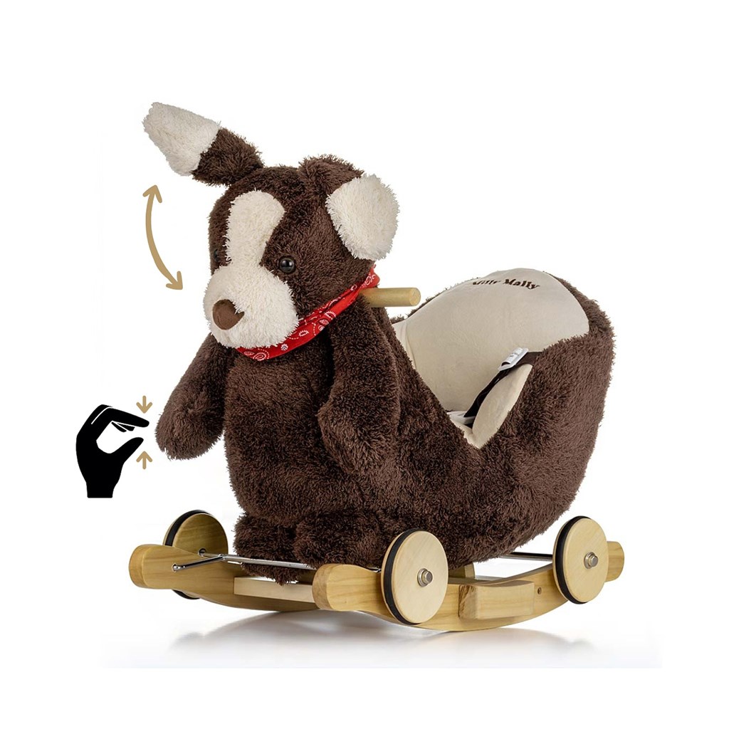 Perro mecedora POLLY está diseñado para los más pequeños (a partir de 12 meses), que encuentran los caballos mecedores tradicionales demasiado grandes. Suave y cómodo asiento en forma de sofá y correas ajustables garantizan confort y seguridad mientras su pequeño se mece y se mueve libremente.