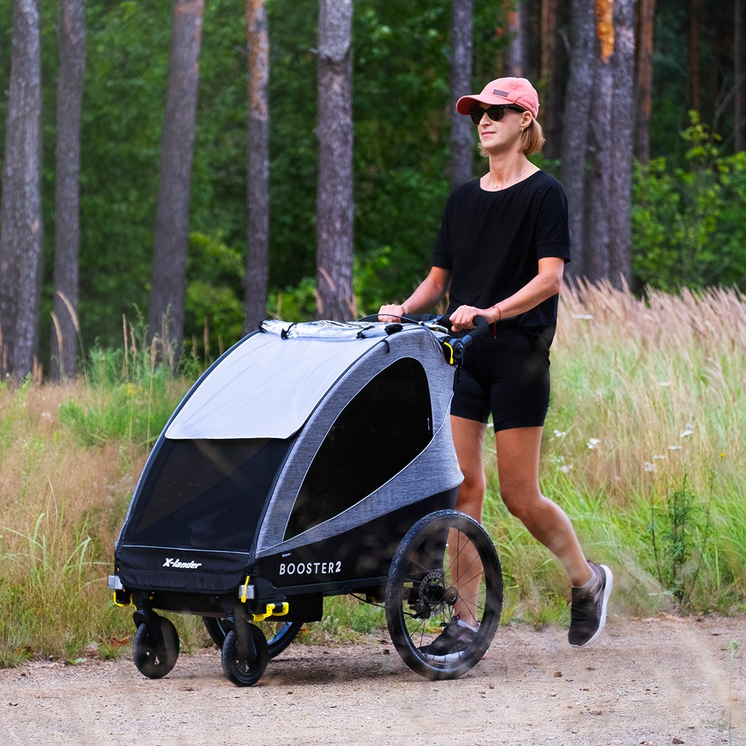 X-lander Booster 2 es un producto multifuncional diseñado para padres activos que desean aprovechar al máximo el tiempo al aire libre con sus hijos. Permite utilizar un solo carrito de diferentes maneras: paseos por terrenos boscosos irregulares, jogging o conectarlo a la bicicleta para largas rutas en ciclovías.