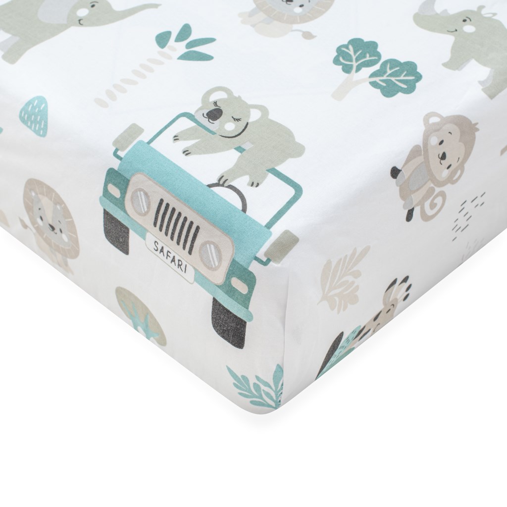 La sábana de algodón New Baby Safari está fabricada con una tela de algodón suave y agradable al tacto. Su hermoso diseño infantil encantará los ojos de los más pequeños. La goma cosida evita que se deslice del colchón, garantiza un ajuste adecuado de la sábana y permite adaptarse a cualquier forma. La sábana es adecuada para colchones de dimensiones 120x60 cm. Es una sábana clásica de algodón, que no es elástica, y por lo tanto tiene unas dimensiones de 90x150 cm, para que se ajuste perfectamente a todo el colchón, incluso por debajo.