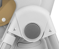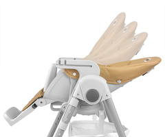 El tapizado de la silla está hecho de piel ecológica y además tiene un suave cojín para los más pequeños. Para la seguridad del niño, está equipada con arneses ajustables de 5 puntos y una barrera adicional contra deslizamientos. En la parte posterior del respaldo hay un asa para colgar la bandeja. El respaldo y el reposapiés se pueden reclinar hasta la posición horizontal. El asiento se puede elevar o bajar en 7 niveles y las patas tienen ruedas de goma integradas. Toda la estructura se pliega de manera fácil y fluida.