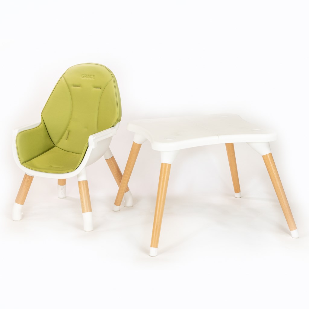 La silla está equipada con arneses de seguridad con acolchado suave en los hombros, protegiendo al niño de rozaduras. La tapicería está hecha de ecopiel, que es resistente a la suciedad y fácil de mantener limpia: simplemente límpiala con un paño húmedo y un detergente suave. La bandeja tiene una hendidura que evita que los objetos se deslicen y dos orificios donde se puede colocar una botella o un vaso. La silla Grace tiene una estructura ligera y estable. Las patas tienen patas de goma, lo que protege la silla de deslizamientos. La versión de silla alta está destinada a niños de 6 meses a 36 meses y 15 kg, y la versión de silla baja más mesa es para niños de 3 a 6 años y 25 kg.