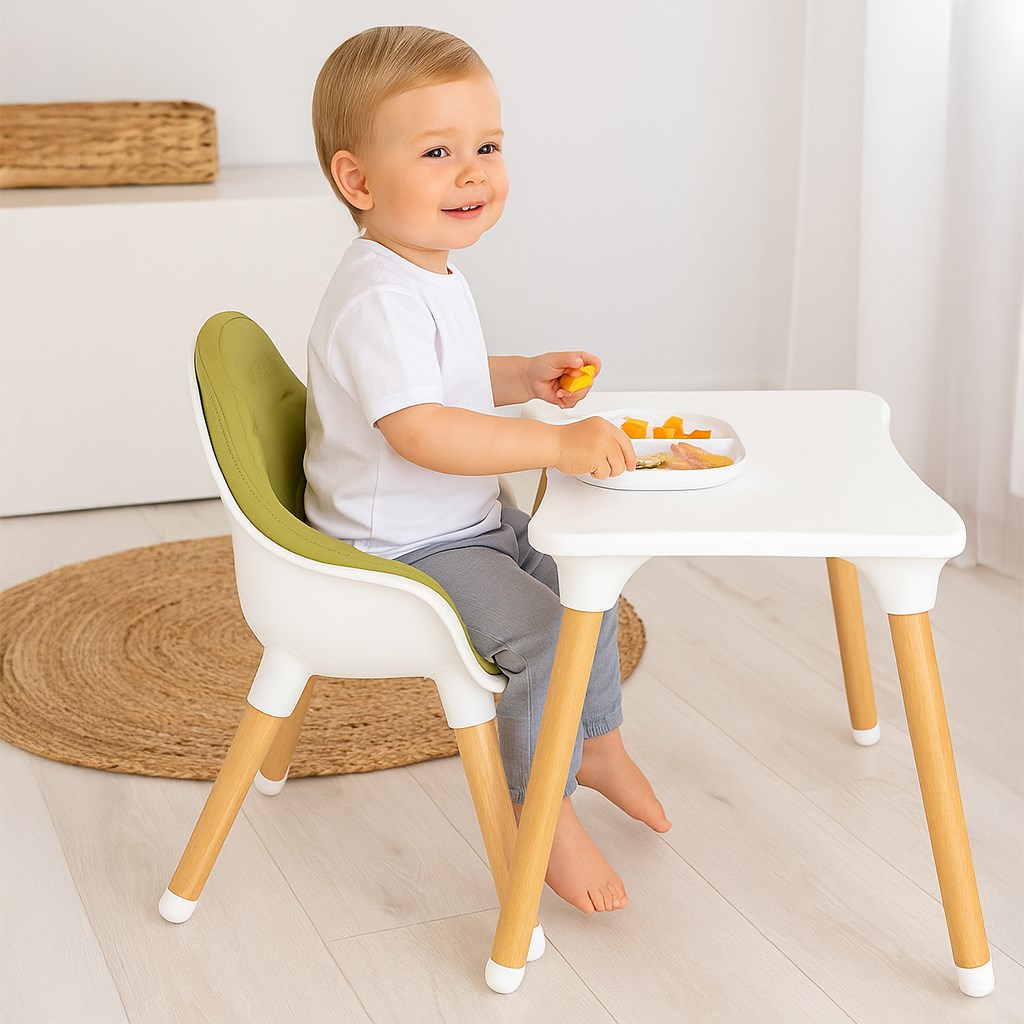 - Silla de comedor que combina 3 funciones: silla alta y baja o conjunto de mesa y silla.