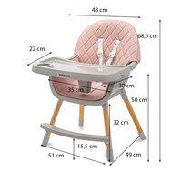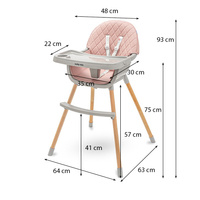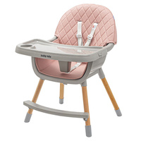 La trona Baby Mix tiene todas las funciones que facilitan la alimentación diaria: bandeja doble ajustable, arnes de 5 puntos, tapicería de eco piel extraíble, reposapiés, cesta de tela, patas antideslizantes. La silla puede convertirse fácilmente en una silla baja quitando la parte inferior de las patas. La trona Baby Mix es adecuada para niños de 6 a 36 meses.