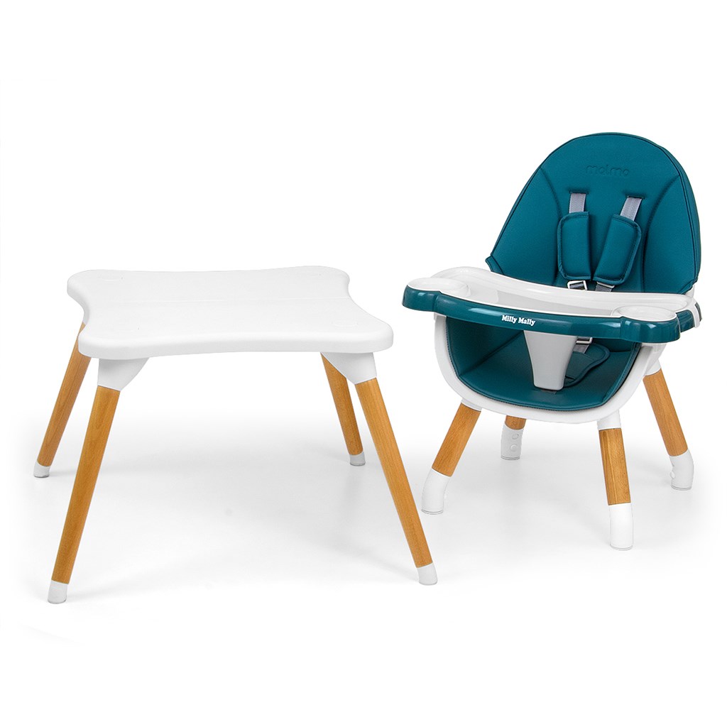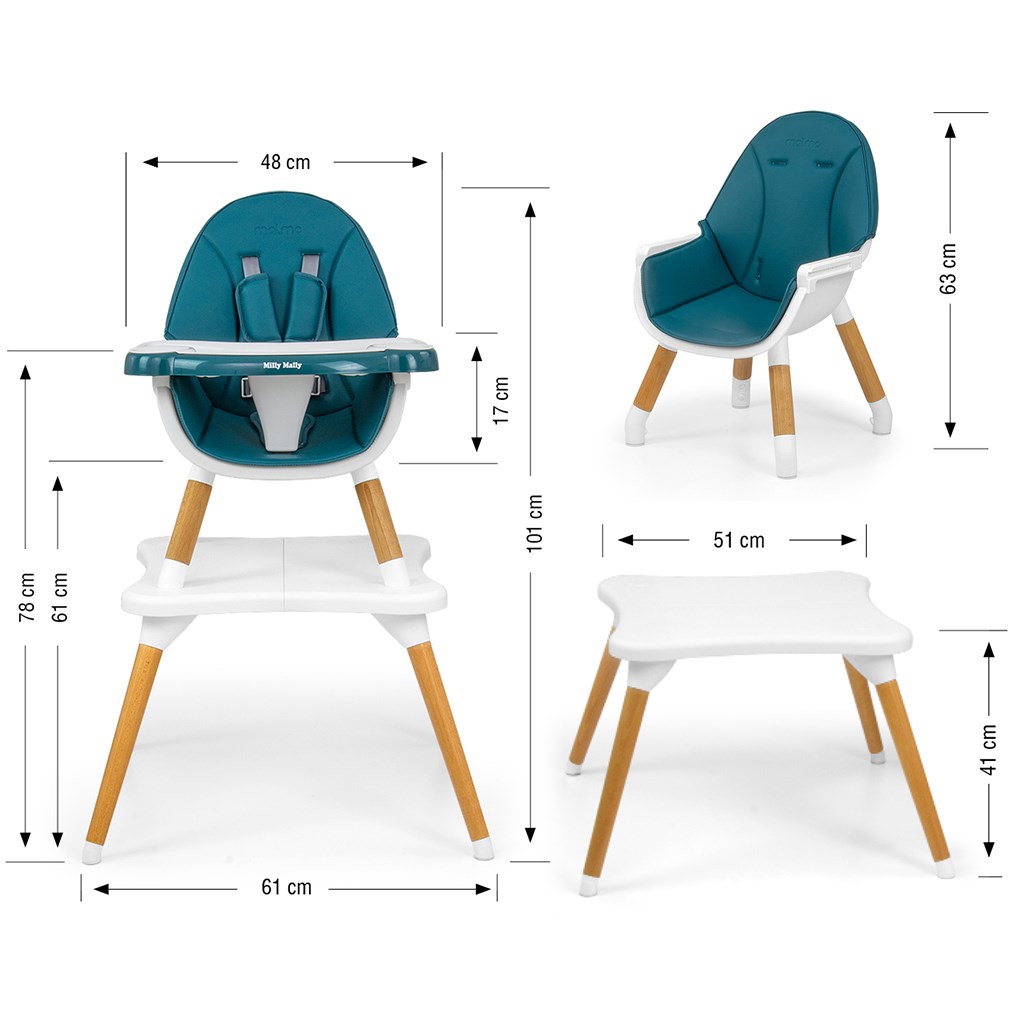 Silla alta moderna y elegante 2 en 1 Malmo para niños. Está fabricada con los materiales de la más alta calidad, combinando funcionalidad y diseño moderno. La versión de silla alta está destinada a niños de 6 meses a 36 meses o hasta alcanzar un peso de 15 kg, y la versión de silla baja más mesa es para niños de 3 a 6 años o hasta alcanzar un peso de 25 kg.