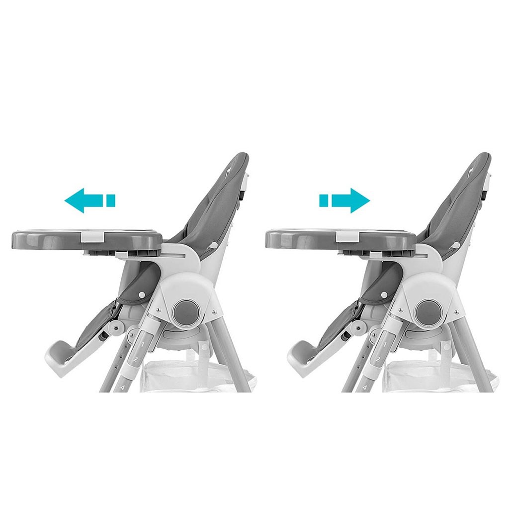El tapizado de la silla está hecho de piel ecológica y además tiene un suave cojín para los más pequeños. Para la seguridad del niño, está equipada con arneses ajustables de 5 puntos y una barrera adicional contra deslizamientos. En la parte posterior del respaldo hay un asa para colgar la bandeja. El respaldo y el reposapiés se pueden reclinar hasta la posición horizontal. El asiento se puede elevar o bajar en 7 niveles y las patas tienen ruedas de goma integradas. Toda la estructura se pliega de manera fácil y fluida.