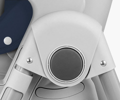 El tapizado de la silla está hecho de piel ecológica y además tiene un suave cojín para los más pequeños. Para la seguridad del niño, está equipada con arneses ajustables de 5 puntos y una barrera adicional contra deslizamientos. En la parte posterior del respaldo hay un asa para colgar la bandeja. El respaldo y el reposapiés se pueden reclinar hasta la posición horizontal. El asiento se puede elevar o bajar en 7 niveles y las patas tienen ruedas de goma integradas. Toda la estructura se pliega de manera fácil y fluida.