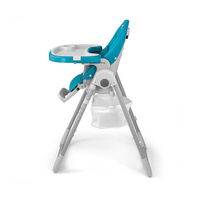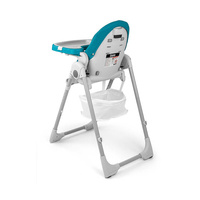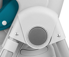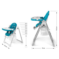 El tapizado de la silla está hecho de piel ecológica y además tiene un suave cojín para los más pequeños. Para la seguridad del niño, está equipada con arneses ajustables de 5 puntos y una barrera adicional contra deslizamientos. En la parte posterior del respaldo hay un asa para colgar la bandeja. El respaldo y el reposapiés se pueden reclinar hasta la posición horizontal. El asiento se puede elevar o bajar en 7 niveles y las patas tienen ruedas de goma integradas. Toda la estructura se pliega de manera fácil y fluida.