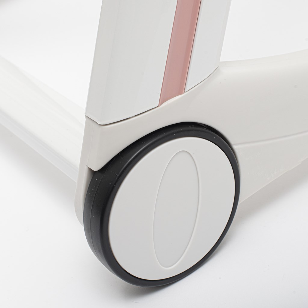 -La trona está equipada con dos ruedas con freno y dos patas de goma.