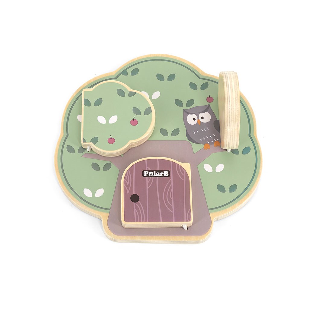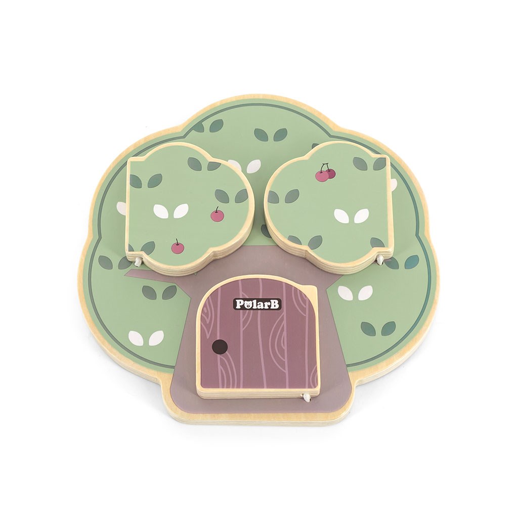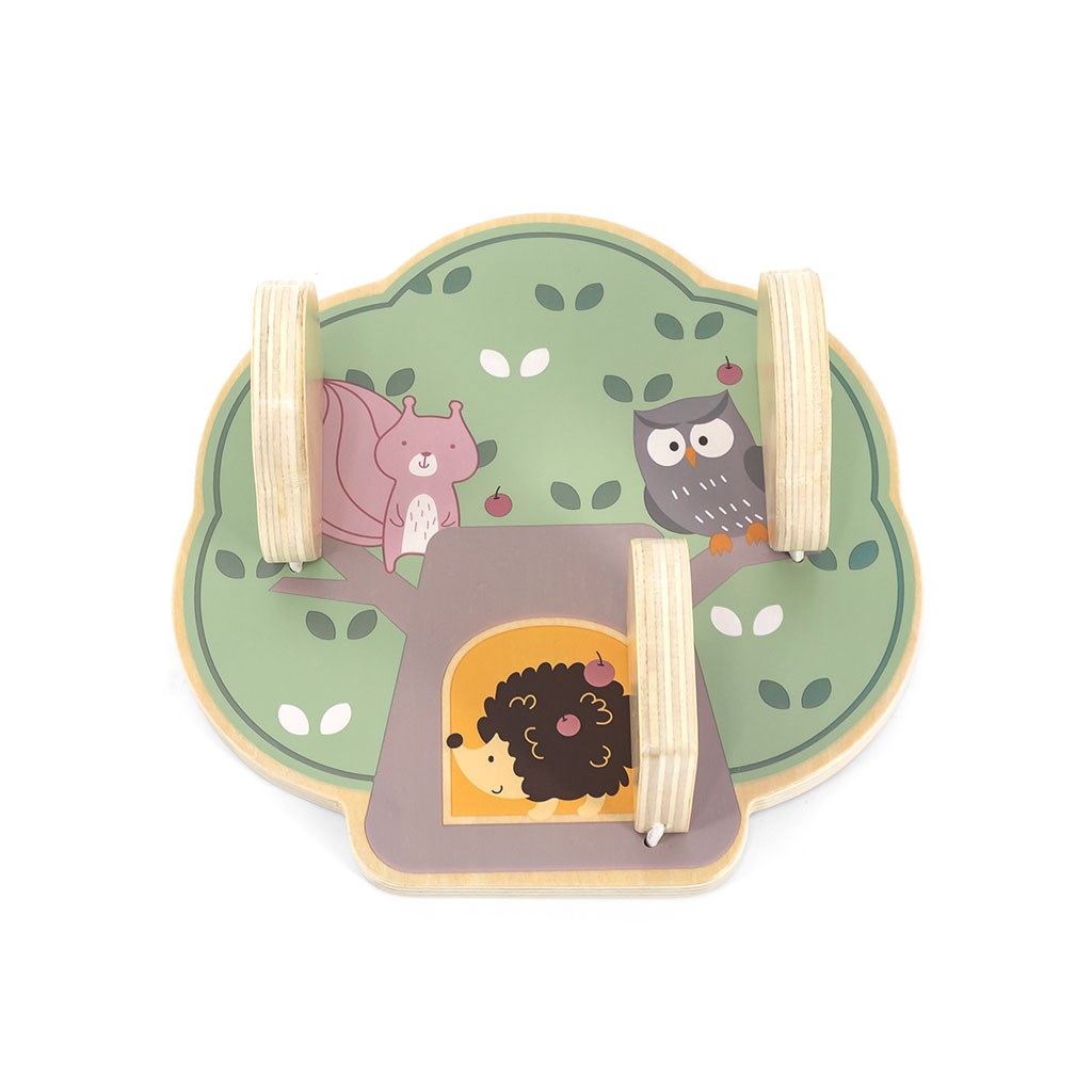 Presentamos una tabla de manipulación de madera en forma de árbol, que desarrolla magníficamente el pensamiento sensorial y lógico de los niños. En la tabla de madera hay 3 puertas y detrás de cada puerta hay un animal diferente: una ardilla, un búho y un erizo que lleva manzanas en su espalda.