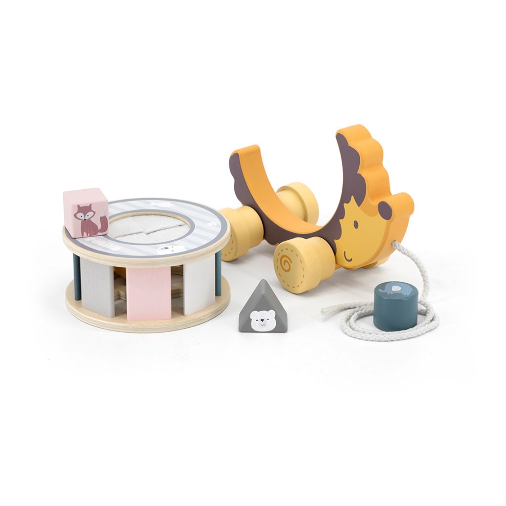 ¡El erizo invita a todos los niños a dar un paseo! Este juguete será un compañero indispensable en muchas excursiones. Al retirar la rueda clasificadora, el bebé aprende a ser preciso y mejora su coordinación mano-ojo. Además, aprende a reconocer formas, colores y a los animales que viven en el zoológico.