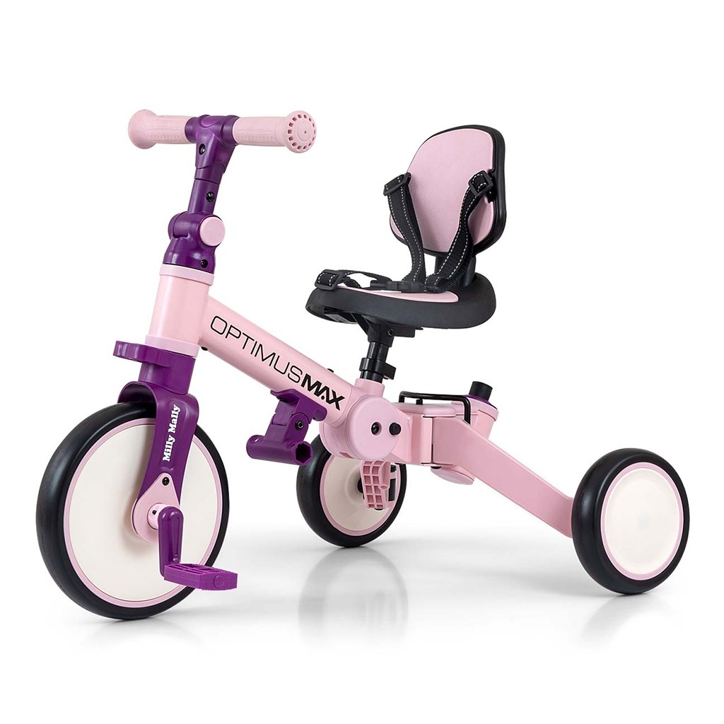 Optimus Max ha sido diseñado para convertirse en una de las mejores opciones para el primer vehículo de su hijo. Gracias a su estable diseño de tres ruedas, proporciona el nivel adecuado de seguridad y facilita la adquisición de nuevas habilidades. Cuando el niño ya haya dominado las bases de andar en bicicleta y no necesite la ayuda de los padres a través del manillar de control, se pueden añadir pedales o transformarlo en un clásico corre-pasillos.