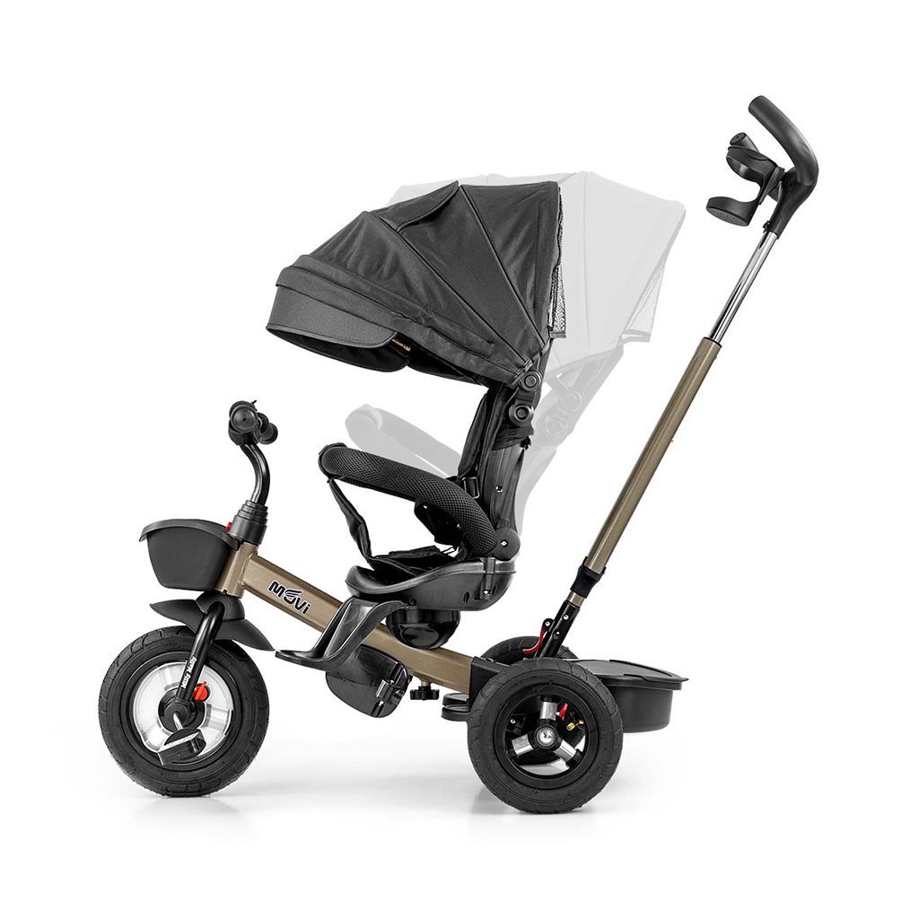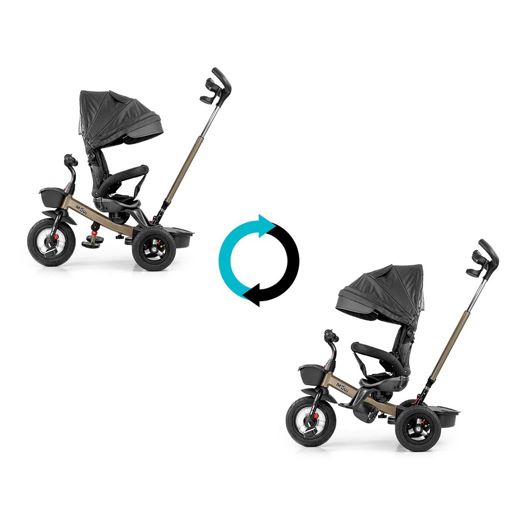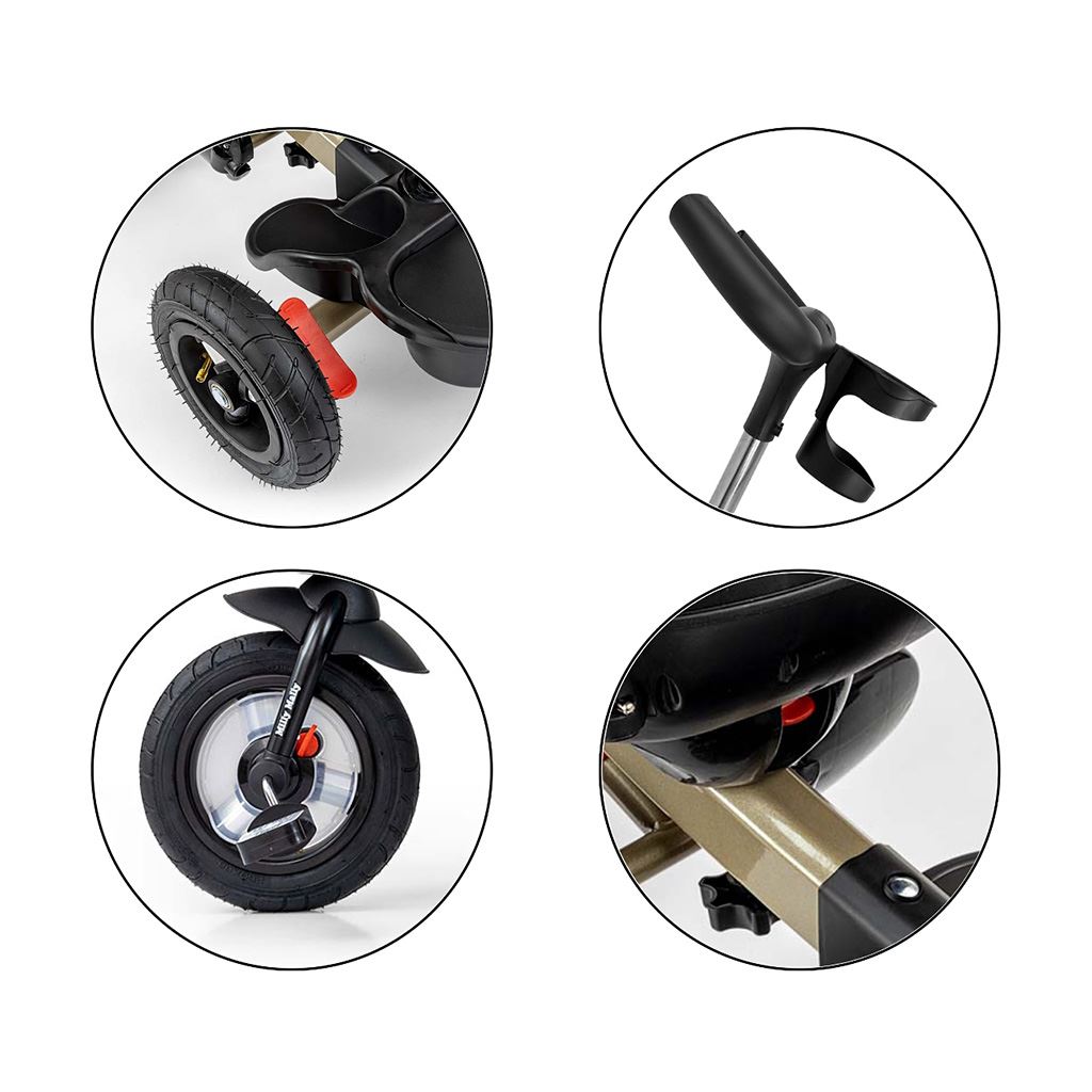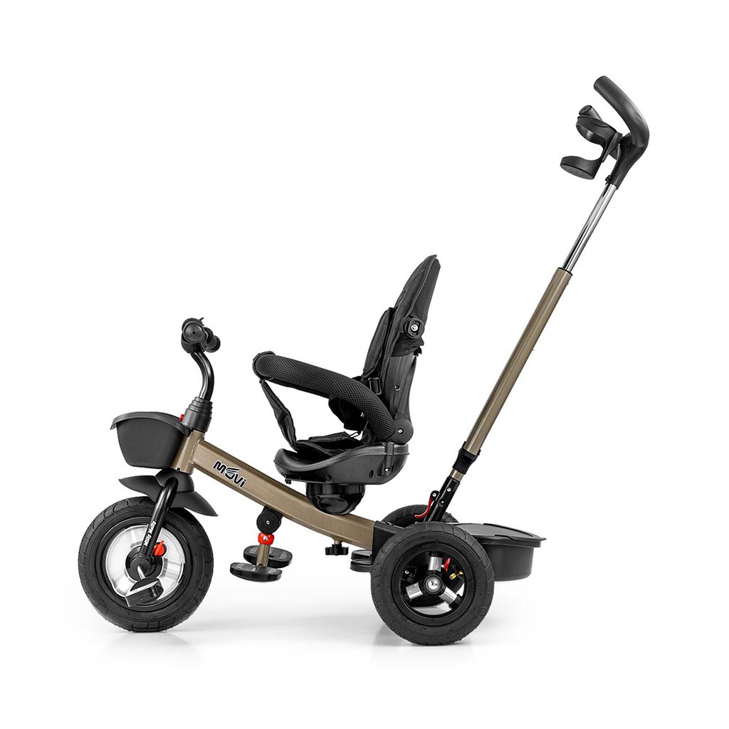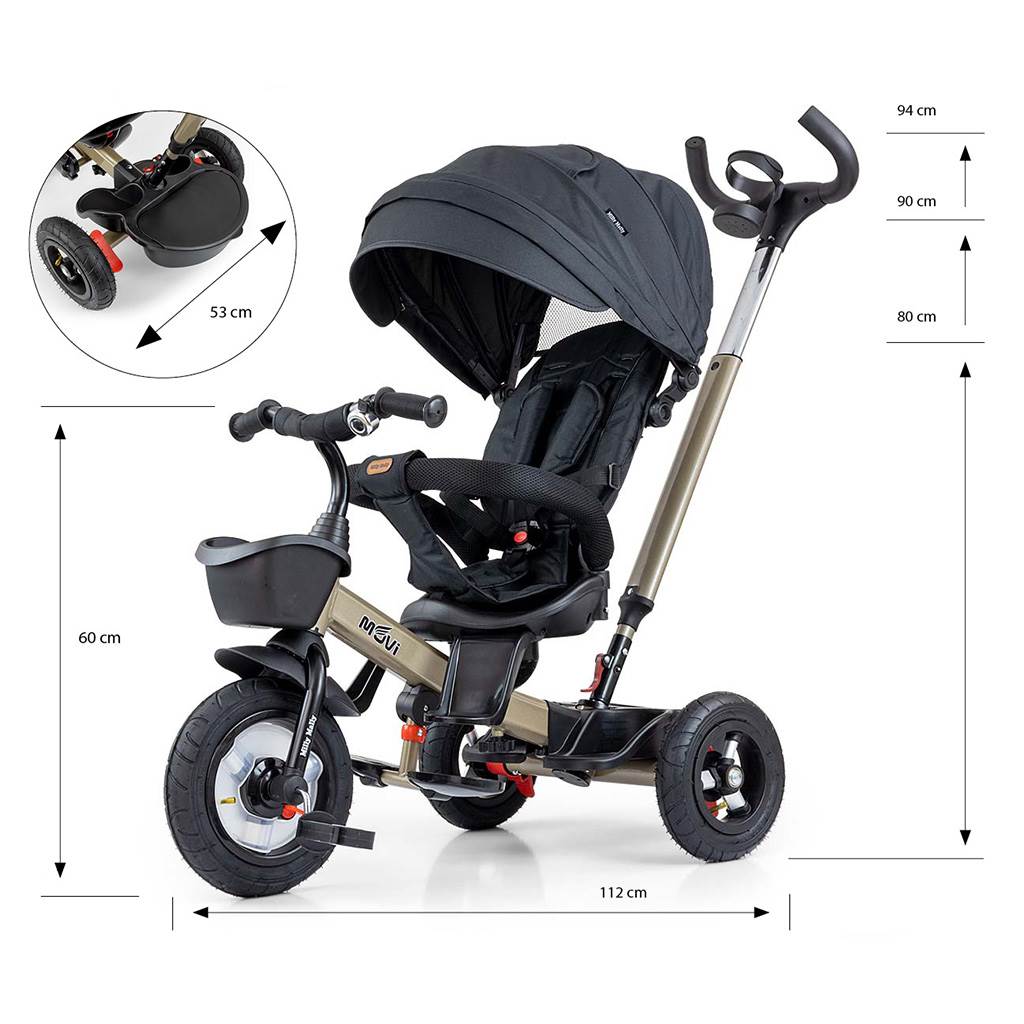 Está fabricado con materiales de alta calidad y duraderos. Tiene un diseño moderno, un asiento cómodo y ergonómicamente diseñado, que es giratorio 360 grados, lo que permite al niño viajar en dirección o en contra de la marcha. La seguridad y comodidad durante el trayecto están garantizadas por una barra de seguridad, cinturones de seguridad de tres puntos, estribos cómodos y grandes ruedas inflables que absorben los impactos y proporcionan una buena adherencia. El triciclo puede ser manejado tanto por el niño como por el padre a través de un mango ajustable para empujar. Al quitar la barra de dirección, la capota plegable que protege del sol y otros componentes, se convertirá en un triciclo. También puede usarse como alternativa a un carrito de golf. Para almacenar juguetes o artículos del niño, cuenta con una práctica cesta de almacenamiento.