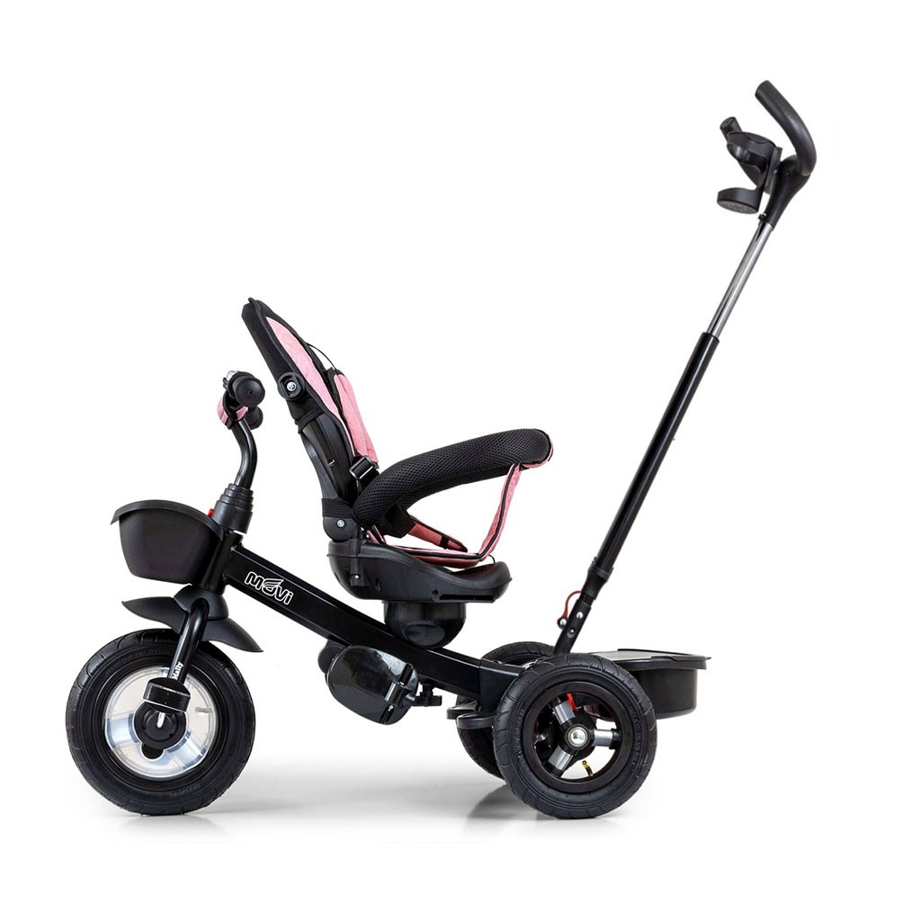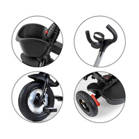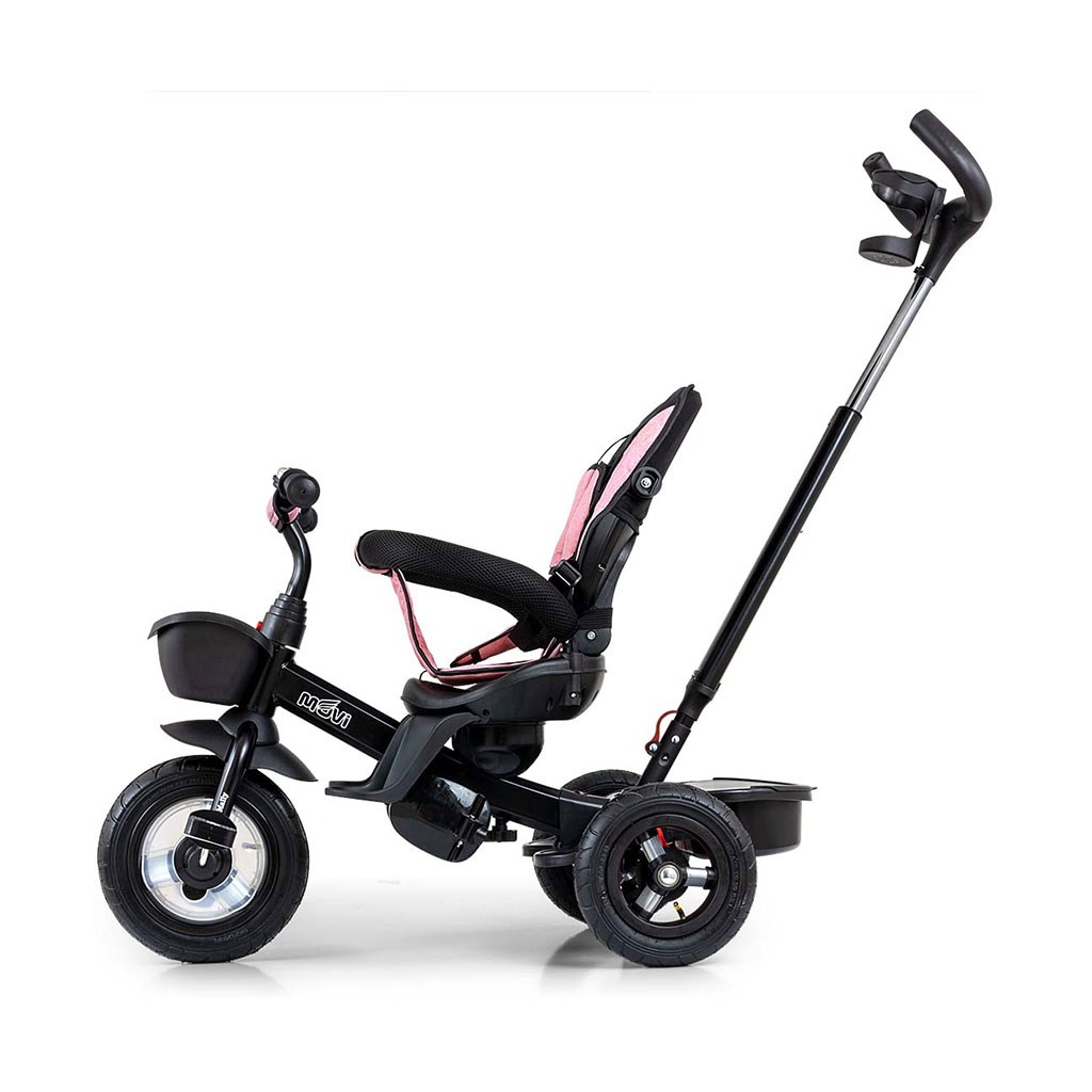 Está fabricado con materiales de alta calidad y duraderos. Tiene un diseño moderno, un asiento cómodo y ergonómicamente diseñado, que es giratorio 360 grados, lo que permite al niño viajar en dirección o en contra de la marcha. La seguridad y comodidad durante el trayecto están garantizadas por una barra de seguridad, cinturones de seguridad de tres puntos, estribos cómodos y grandes ruedas inflables que absorben los impactos y proporcionan una buena adherencia. El triciclo puede ser manejado tanto por el niño como por el padre a través de un mango ajustable para empujar. Al quitar la barra de dirección, la capota plegable que protege del sol y otros componentes, se convertirá en un triciclo. También puede usarse como alternativa a un carrito de golf. Para almacenar juguetes o artículos del niño, cuenta con una práctica cesta de almacenamiento.