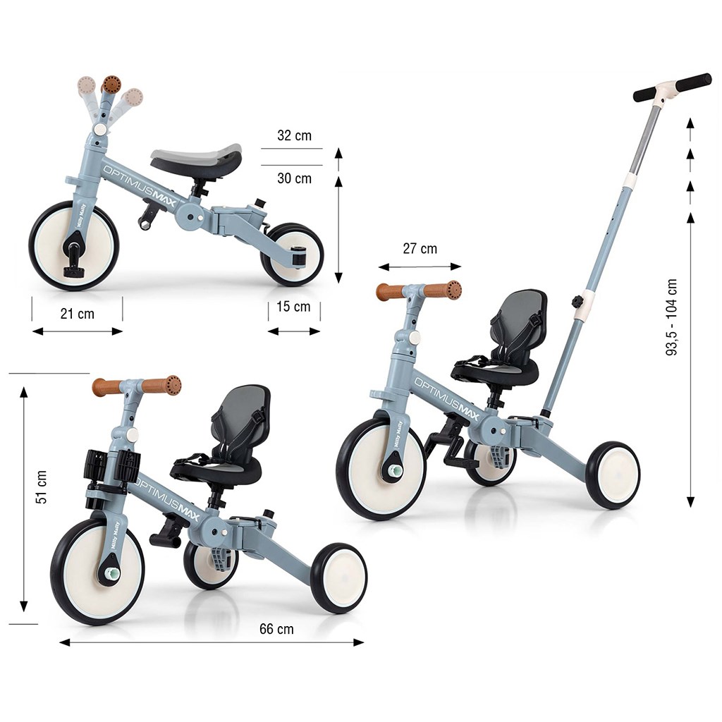 Optimus Max ha sido diseñado para convertirse en una de las mejores opciones para el primer vehículo de su hijo. Gracias a su estable diseño de tres ruedas, proporciona el nivel adecuado de seguridad y facilita la adquisición de nuevas habilidades. Cuando el niño ya haya dominado las bases de andar en bicicleta y no necesite la ayuda de los padres a través del manillar de control, se pueden añadir pedales o transformarlo en un clásico corre-pasillos.