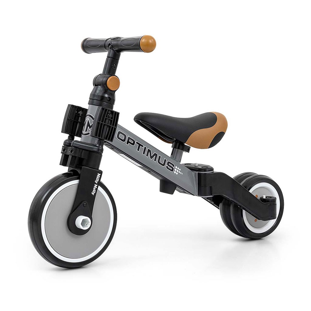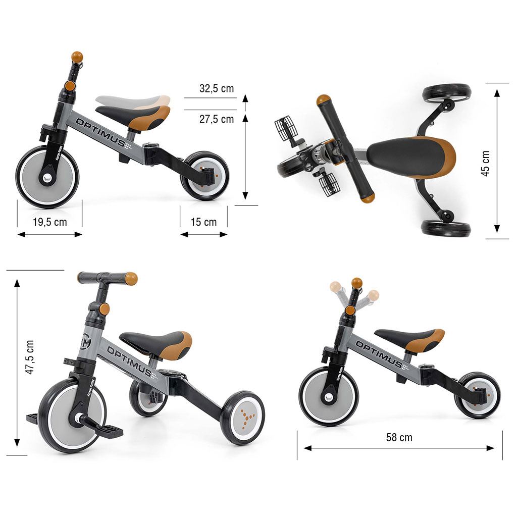 La triciclo infantil universal Milly Mally 3 en 1 Optimus ha sido diseñada para ser lo mejor que puedes ofrecer a tu pequeño corredor. Gracias a su construcción estable, proporciona un nivel máximo de seguridad para el niño, facilitándole así la adquisición de nuevas habilidades. La mayor ventaja de este triciclo es su versatilidad. Una vez que el niño adquiere las bases de la conducción, podemos acoplar los pedales o, en un instante, transformarlo en un clásico correpasillos de una sola rueda. Las ruedas de espuma absorben muy bien los impactos, ofrecen una buena adherencia, aseguran comodidad durante la conducción y no fatigan a tu pequeño piloto. La distancia adecuada entre las ruedas proporciona una estabilidad excepcional y seguridad durante su uso tanto en interiores como en exteriores. El tope evita que se giren el manillar.