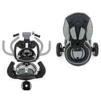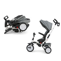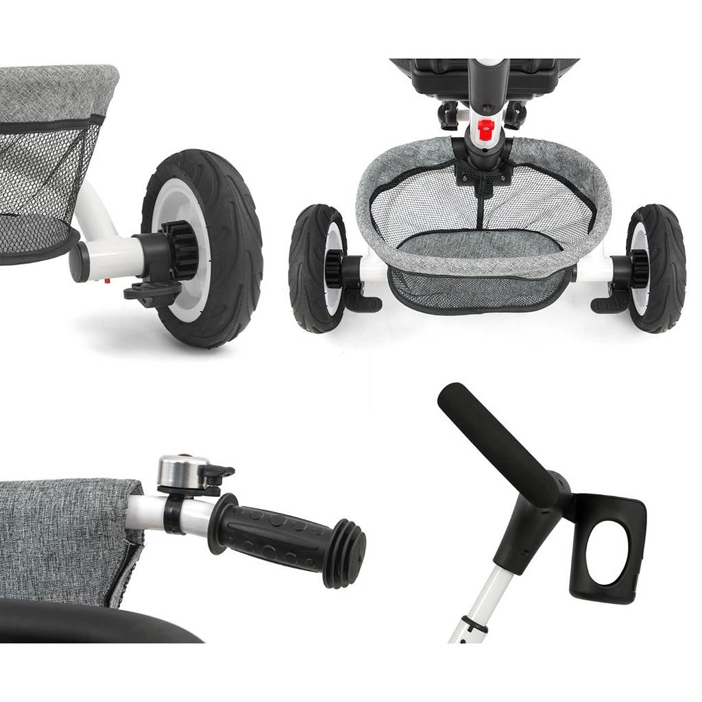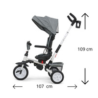 Está fabricada con materiales de alta calidad y resistencia. Tiene un diseño moderno, un asiento cómodo y ergonómicamente moldeado, que se puede girar 360 grados, lo que permite que el niño viaje en la dirección que desee. La comodidad y seguridad durante el paseo están garantizadas por una barrera, cinturones de seguridad de tres puntos, reposapiés cómodos o ruedas de goma que absorben perfectamente los impactos y proporcionan una buena adherencia. La triciclo puede ser controlada tanto por el niño como por el padre mediante un mango ajustable para empujar. Al quitar la barra de dirección, la capota plegable que protege del sol o otros componentes, se convierte en un triciclo. También se puede usar como una alternativa a un cochecito de golf. Para el almacenamiento de juguetes o artículos para el niño, cuenta con una práctica canasta de almacenamiento.