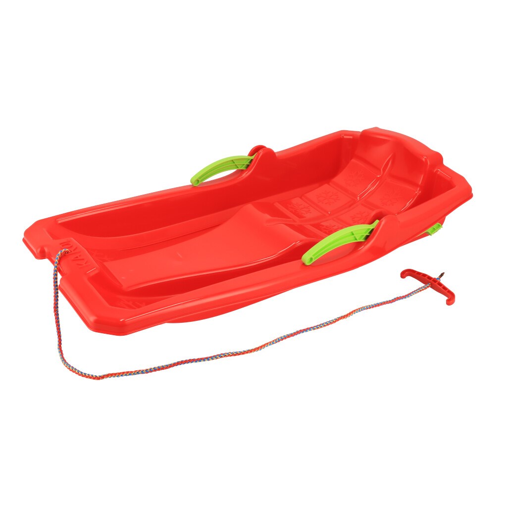Trineos de plástico con frenos Baby Mix KAROL. Este modelo, gracias a los frenos, permite un detención segura, control de dirección y minimiza las colisiones no deseadas al bajar colinas. Están fabricados con un plástico de alta calidad, resistente al frío hasta -20°C. Vienen equipados con una cuerda con asa.