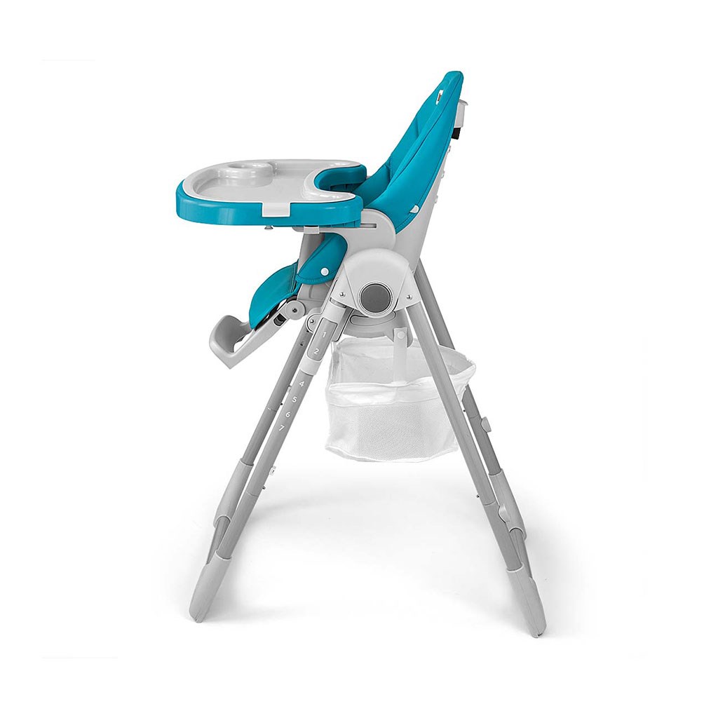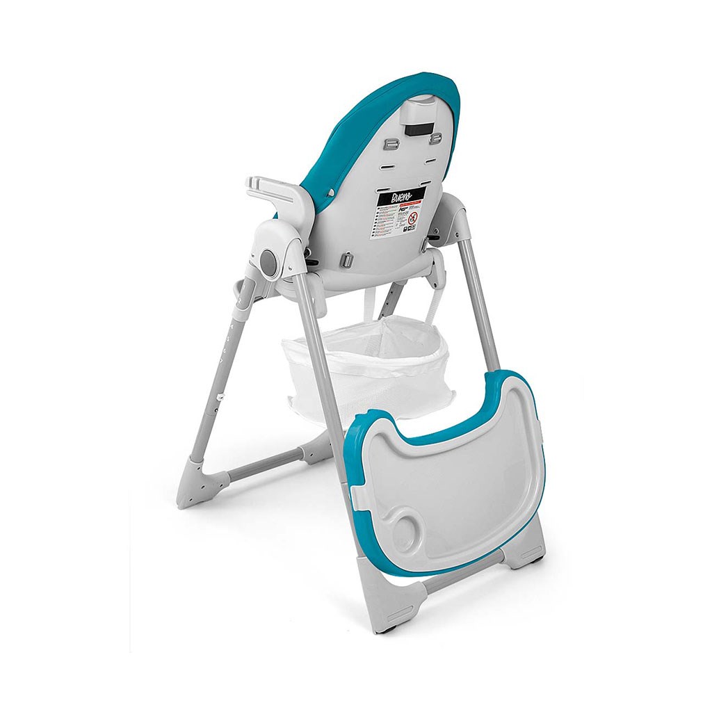 El tapizado de la silla está hecho de piel ecológica y además tiene un suave cojín para los más pequeños. Para la seguridad del niño, está equipada con arneses ajustables de 5 puntos y una barrera adicional contra deslizamientos. En la parte posterior del respaldo hay un asa para colgar la bandeja. El respaldo y el reposapiés se pueden reclinar hasta la posición horizontal. El asiento se puede elevar o bajar en 7 niveles y las patas tienen ruedas de goma integradas. Toda la estructura se pliega de manera fácil y fluida.