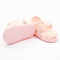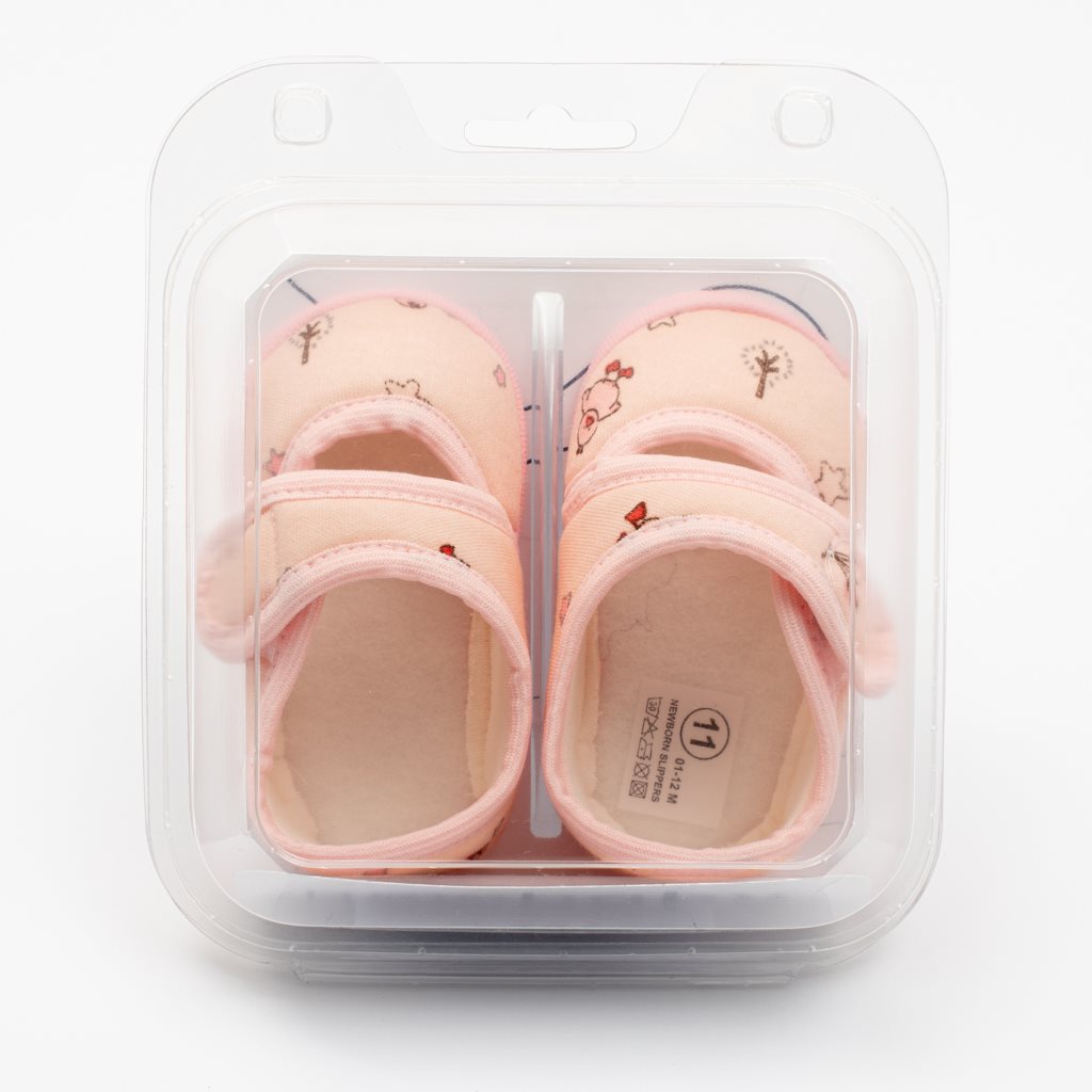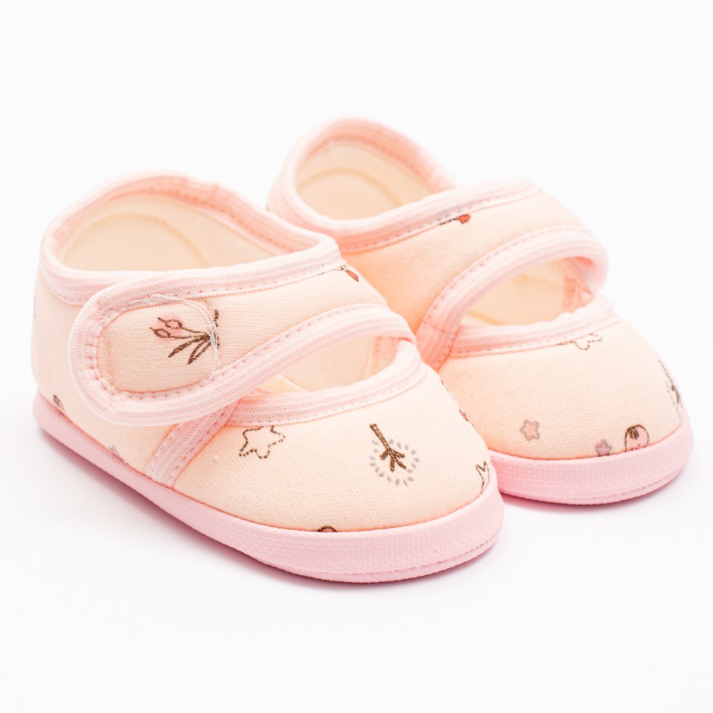 Zapatillas para bebés New Baby. Bonitos zapatos con un diseño moderno y cierre de velcro. Las zapatillas se ajustan al pie y tienen un interior amplio, lo que permite un libre movimiento de los dedos y los músculos. El producto no está destinado a caminar. Son muy ligeras con una suela sintética delgada. Composición: 100% algodón. Suela: material sintético PVC libre de BPA. Longitud de la plantilla interior 10 cm. Destinadas para niños de 0 a 3 meses. Vienen en una práctica caja. Aviso: debajo de la plantilla textil a veces hay una plantilla de papel que mantiene la forma de la zapatilla. Antes de su primer uso, retire esta plantilla de papel.